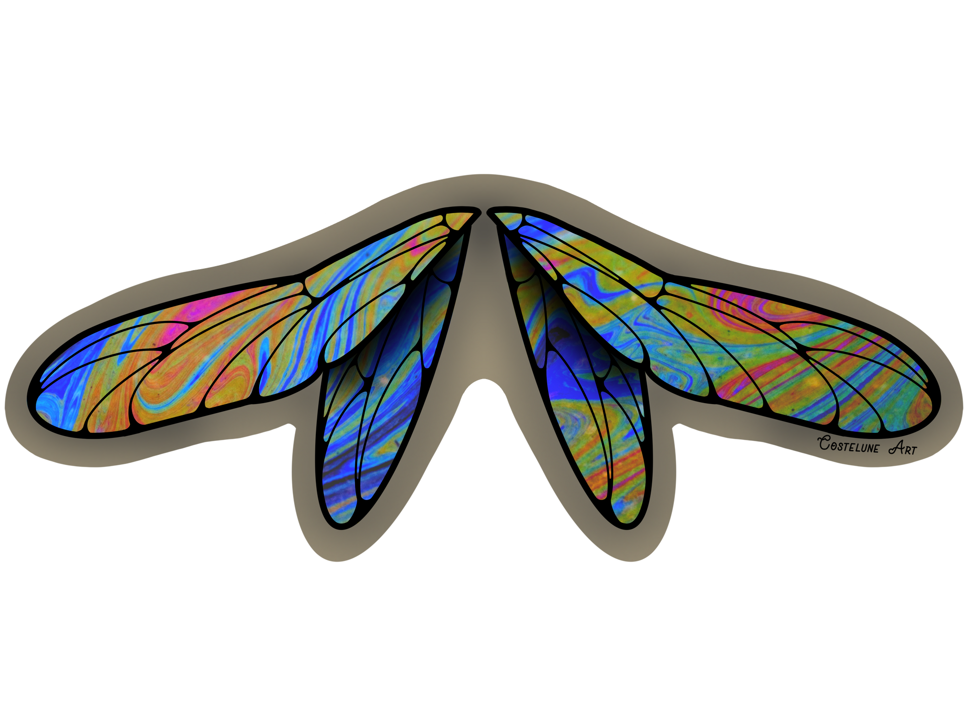 Dark die-cut sticker printed on premium clear matte vinyl. Good for bottles, cars, notebooks and more! Featuring a pair of dragonfly wings with an oil slick design, this sticker design is minimal and fantastical, without being overly so thanks to the darker ink. (3"x1.21")