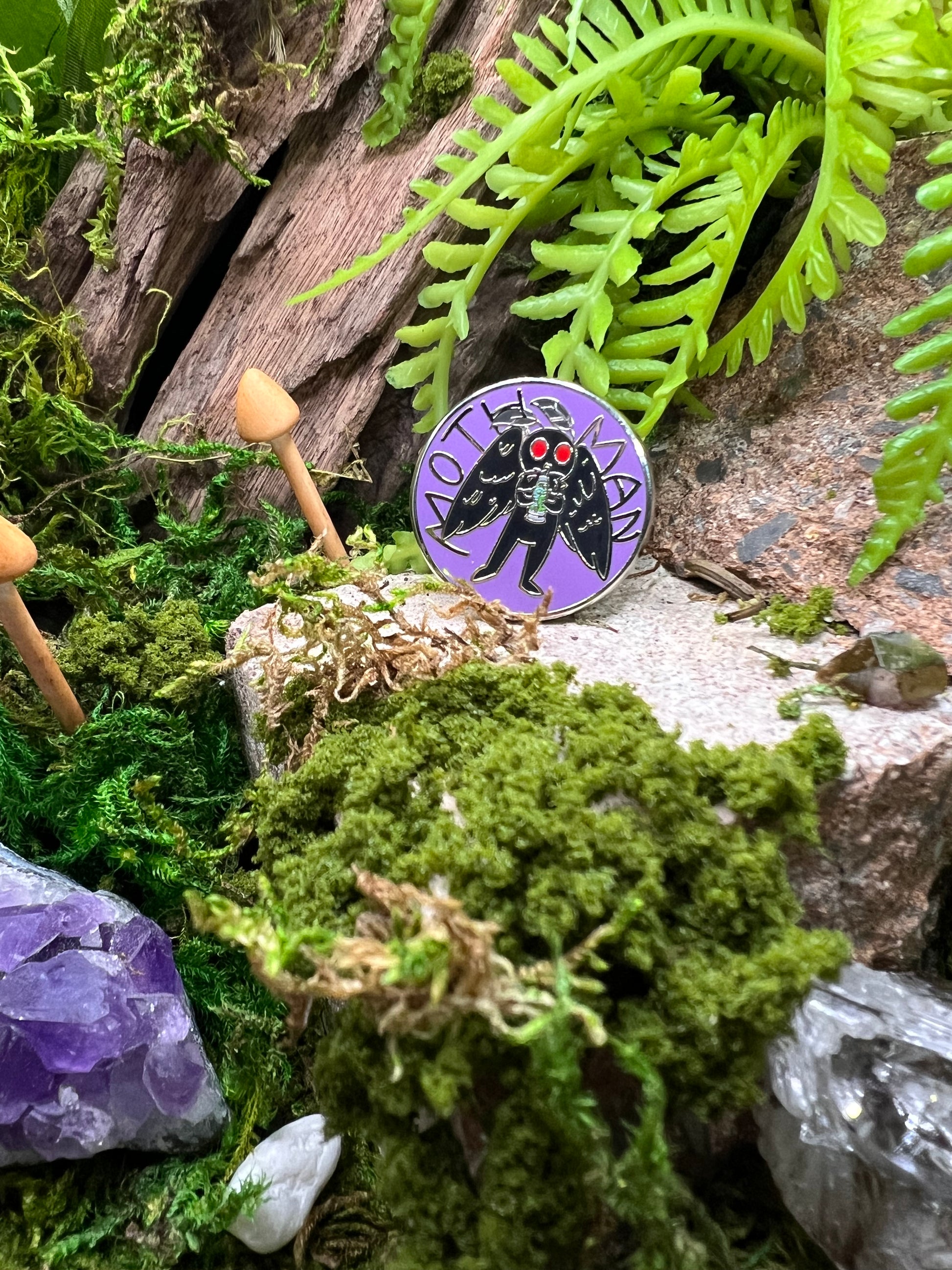Add a touch of creepy-cute to your style with The Mothman Pin. This 1 inch hard enamel pin features the well loved Mothman clutching a lava lamp, sipping from his beverage of choice, blending whimsy and spooky in one playful accessory. Perfect for pin collectors or anyone who loves a whimsical, bold statement.